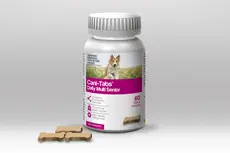 Tabletas Palatables Suplemento vitamínico para perros geriátricos Formulación Vit. A 1500 UI, Vit. D3 75 UI, Vit. E 25 UI, Vit. K1 100 mcg, Vit. B1 4 mg, Vit. B2 2 mg,