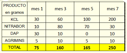 NOTA: he elegido los fertilizantes que más se venden en la zona para que sean de fácil consecución, pero cada uno es libre de cambiar la marca y de aumentar o disminuir la dosis según lo desee o su análisis de suelo lo indique: