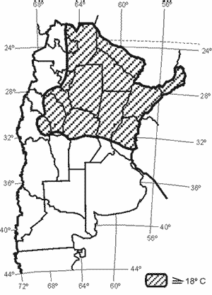 En la Figura 1 se muestra el límite térmico, definido por la isoterma media anual de 18º C. Esta área comprende la totalidad de las provincias de Chaco, Formosa, Misiones, Corrientes y Santiago del Estero. Abarca además el sector oriental de Jujuy, centro y este de Salta, gran parte de Tucumán, parte de La Rioja, Catamarca y San Juan, norte y centro de Córdoba, de Santa Fe y Entre Ríos.