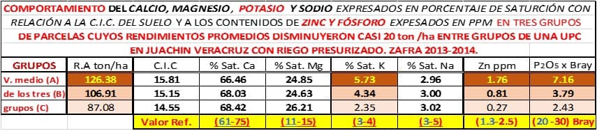 En una Unidad de Producción Cañera en Juachin Veracruz con riego presurizado y subdividida en 16 parcelas o unidades de riego; el rendimiento agrícola promedio de las dos últimas zafras mostraba marcadas diferencias entre las parcelas. Los análisis de suelo de cada parcela fueron evaluados de forma conjunta con los rendimientos agrícolas correspondientes, para facilitar la interpretación, se formaron el Grupo A, B y C según la magnitud de los rendimientos altos (126.38), medios (106.91) y bajos (67.08) ton/ha respectivamente. La diferencia entre los rendimientos medios de cada grupo fue de casi 20 ton/ha.