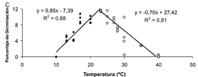 Utilizando el rango de temperaturas 25-40 ºC se obtuvo una ecuación que extrapolada a cero estimó la temperatura máxima a partir de la cual no existe germinación.