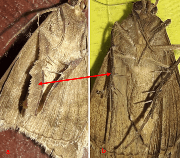 Figura 13. Vista dorsal adultos de Mocis. a) hembra, b) macho.