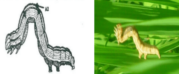 Larva. Presentan propatas completamente ausentes en A3 y A4. Propatas anales, más o menos del mismo tamaño de las de A5 y A6. Cuerpo de color variable pero sin las bandas oscuras subdorsales. Patas torácicas nunca negras; cuerpo de color variable sin microespinas ni pináculos (áreas esclerotizadas planas) negros. Abdomen con dos bandas oscuras transversales en los márgenes de A2; cuerpo pardo con bandas dorsales longitudinales oscuras. Cabeza con líneas longitudinales; al ser perturbados se dejan caer al suelo. Caballero, et al 1994 (figura 5).