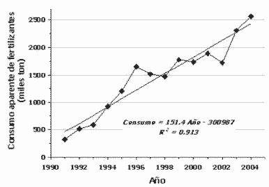 Figura 1: Consumo aparente de fertilizantes en Argentina. Período 1991-2004. Elaborado a partir de información de SAGPyA, Fundación Producir Conservando y Fertilizar A.C.
