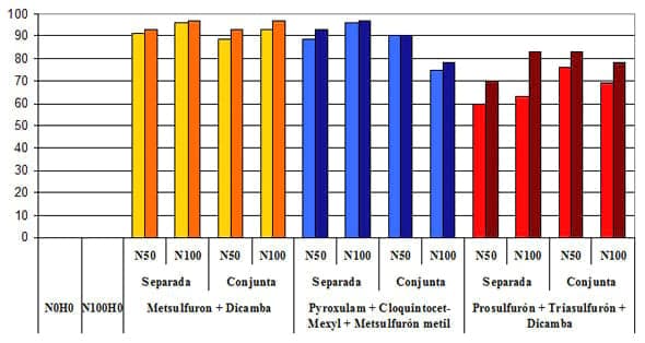 Los resultados obtenidos sugieren la factibilidad de realizar aplicaciones conjuntas de herbicidas y fertilizantes en forma segura, sin efectos fitotóxicos ni depresión de control, aunque este efecto se modifica según el herbicida utilizado. Con este fin, (Metsulfurón + Dicamba) parece ser el menos afectado por aplicaciones conjuntas de herbicida y fertilizante, mientras que (Pyroxulam + Cloquintocet-Mexyl + Metsulfurón metil) se ubica en el extremo contrario, especialmente cuando se lo combina con altas dosis de N.