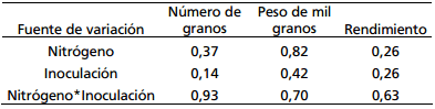 Tabla 3: Resumen de análisis de la varianza. Valores de valor P para número de granos, peso de granos y rendimiento.