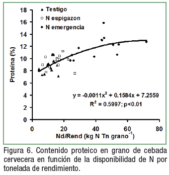 El contenido proteico se relacionó significativamente a la disponibilidad de N por tonelada de rendimiento producido (Figura 6). Para obtener un contenido proteico entre 10% y 11% es necesario disponer entre 20.2 y 30 kg N Tn grano-1.