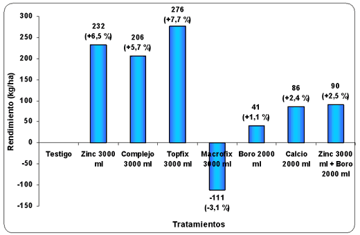 *Aun cuando no se determinaron diferencias estadísticas, los mejores tratamientos permitieron obtener un diferencial de rendimiento con relación al testigo. Los tratamientos destacados incluyeron el uso de Zinc, Complefix y Topfix, los cuales produjeron un diferencial de rendimiento con relación al testigo de 232 (6,5 %), 206 (5,7 %) y 276 kg ha-1 (7,7%) respectivamente.