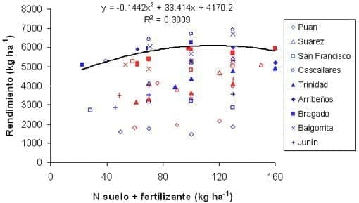 Considerando todos los ensayos, los rendimientos se relacionaron de manera poco estrecha con la disponibilidad de N, considerando la suma del N en el fertilizante y en el suelo a la siembra. Si bien el ajuste fue relativamente bajo (figura 1), fue la variable que explicó en mayor medida los rendimientos. Es evidente que el factor sitio/año es muy potente en una red tan amplia. Se puede observar, empero, que los ensayos que tuvieron rendimientos máximos menores a 4000 kg ha-1 (Puan 2005, San Francisco 2005, Junín 2005, Puan 2006 y Junín 2006) no respondieron a la fertilización nitrogenada (Figura. 1). Los sitios con respuesta fueron aquellos con potencial de rendimiento alto o intermedio. Considerado los 5 ambientes de mayor potencial productivo, los valores máximos se obtuvieron con dosis de entre 100 y 130 kg N ha-1. (Figura 1)