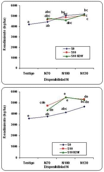En el mismo sentido, el agregado de dosis elevadas de N y S en cebada se manifestó en una marcada respuesta residual en maíz de segunda (Ferraris et al., 2008, Figura 10). El maíz fue fertilizado de manera uniforme con 19 kg P y 64 kgN ha-1, respectivamente. Un análisis de N-nitratos y S-sulfatos a la siembra de maíz no arrojó diferencias entre tratamientos, lo que hace presumir que los residuos y la biomasa microbiana constituyeron en esta experiencia reservorios de N y S orgánico, que se mineralizó durante la estación estival para suplementar al cultivo.
