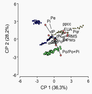 Cuando se consideraron todas las variables respecto al P en MS, la variabilidad total fue de 62%, se agrupan por un lado variables como RMS, EUA y ppcc, y por otro se seleccionan Pi, Pe y Po/Po+Pi. Lo que sugeriría que no sólo es importante el fósforo disponible en la solución del suelo sino también el resto de las formas de P, y sobre todo el equilibrio de las formas orgánicas con el P total (Po+Pi). Fernández et al. (2005) han demostrado el importante papel de la actividad de los microorganismos en el ciclo de los nutrientes, especialmente el P. Por tanto, el contenido de MO del suelo puede estar relacionado con la disponibilidad de P en virtud de su importancia como fuente de alimento para los microorganismos, no en virtud de su contenido en este nutriente (Needelman et al., 1999). En este trabajo el análisis de los resultados ha demostrado que el fósforo que asimila la planta depende no sólo del P disponible para el cultivo. Sino también del Pi, y del equilibrio de las formas orgánicas con el total del suelo (Po+Pi).