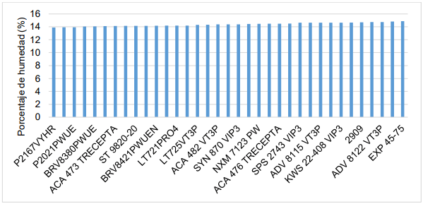 La humedad media de cosecha fue de 14,4 %, siendo los diez materiales de mayor velocidad de secado: P2167VYHR, DUO 225 PWU, P2021 PWUE, P1804 PWU, BRV 8380 PWUE, ARG 7718 VT3PRO, ACA 473 TTRECEPTA, DK 72-72 TRE, ST 9820-20 y DK 73-03 TRE (Gráfico 4).