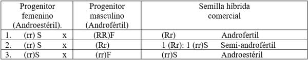 Cuando se tiene un grupo de líneas nuevas en las que se desconoce la fertilización del polen, se cruzan todas con una línea androestéril (A) y luego se siembran todas las F1. Se obtienen tres tipos de progenies: androfértil, semifértil y androestéril (Cuadro 1). En sorgo para grano solo interesa la primera y la tercera. En las F1 androestériles las líneas utilizadas como progenitor masculino le llaman lineas mantenedoras o líneas “B” o sea (rr)F con citoplasma fértil y las F1 androfértiles son líneas “R” o restauradoras (RR)_, con genes dominantes para la fertilidad en el núcleo.
