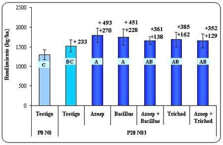 La mejor estrategia resultó de la combinación de fertilización fosforo-nitrogenada con Azospirillum o Bacillus. Sin embargo, no se observaron efectos aditivos por el uso conjunto de ambos microorganismos.