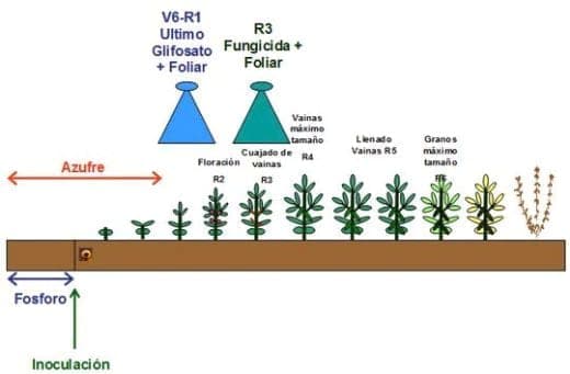 La nutrición en soja integra la provisión de nitrógeno (N) por fijación biológica (FBN), y el aporte de fósforo (P) y azufre (S) agregados al suelo, por lo general al momento de la siembra. Sin embargo, en los últimos años se ha experimentado la aplicación de otros elementos, como una forma de complementar la nutrición del cultivo. Para algunos elementos que no afectan la germinación, se ha evaluado el tratamiento de semilla i.e. zinc (zn), molibdeno (Mo) o cobalto (Co). Sin embargo, es más frecuente la aspersión foliar de los mismos. Por lo general, los fertilizantes foliares se aplican de manera conjunta con agroquímicos defensivos para la protección del cultivo, siempre que las formulaciones sean compatibles (Figura 1).