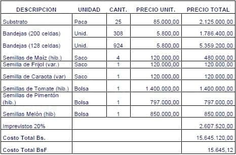 La comercialización de las Semillas de Maíz, Frijol y Caraota se presentan en saco de 20 o 25kg, garantizando 100.000 semillas y la del cultivo de Melón es en bolsa o lata, garantizando 15.000 semillas, por lo tanto en un ciclo de producción de plántulas (plantitas), que está comprendida en un lapso de 7-10 días tenemos los siguientes valores de producción.