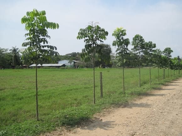PLANTACIÒN LINEAL, TAMBIÈN LLAMADA CERCA VIVA DE CAOBA Swietenia macrophylla , 18 meses de edad, 4 m. entre plantas, FINCA DOBLE T, OBISPO, ESTADO BARINAS, PLAN DE FOMENTO LECHERO NESTLÈ, FOTO EEE.
