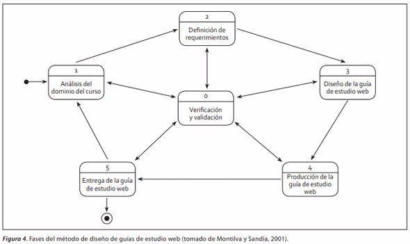 El desarrollo del curso de Agroforestería se fundamenta en el método planteado por Montilva y Sandia (2004), citados por Mora et al. (2007). En la figura 5 se presenta la estructura tipo estrella de esta metodología, la que integra seis fases, cinco de las cuales se ejecutan consecutivamente bajo el control de la fase de verificación y validación (Sandia y Montilva, 2001). Los autores indican que el método cubre todo el ciclo de vida de una guía de estudio, desde el análisis del dominio (contexto de la guía de estudio), a través de las fases de especificación de requerimientos, diseño y producción de guías de estudio, hasta llegar a la fase de entrega del producto.
