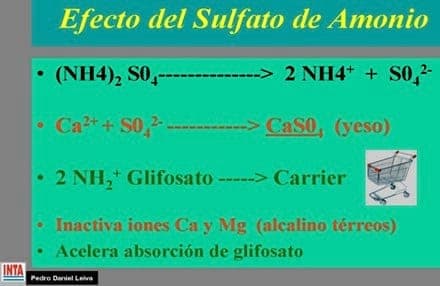 El catión amonio es muy soluble y se combina con el Glifosato, actuando como carrier o trasportador, incrementando notablemente la velocidad de absorción del herbicida (aumenta la dosis total absorbida por la maleza).