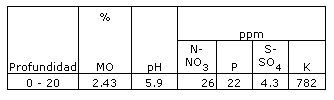 El mismo día, pero previo a la siembra, se tomó una muestra de suelo de 0 - 18 cm para la determinación de propiedades químicas (Cuadro 1) y de 2 a 7 cm para la determinación de humedad (Cuadro 2). Se usaron desde antes de la siembra y hasta la cosecha herbicidas de control total y residual para mantener el sitio libre de malezas. Se utilizaron también insecticidas y funguicidas para el control de insectos (chinches e isocas) y prevención de enfermedades.
