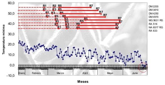 Figura 2: Temperaturas mínimas y etapas fenológicas de los cultivares evaluados