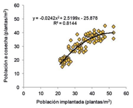 La población de plantas cosechadas tuvo una respuesta de tipo cuadrática en función del número de plantas implantadas (Figura 2). Esto significa que los incrementos fueron decreciendo por cada planta adicional implantada/ m2. En otras palabras, en la medida que se implantaron más de 45 plantas/m2, el número de plantas cosechadas prácticamente no se incrementó debido a la competencia de las plantas en la hilera.