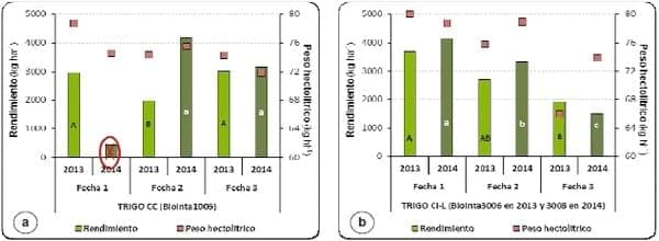 El trigo alcanzó rendimientos máximos que superaron los 4000 kg en 2014, en fecha 2 y fecha 1 para el CC y CI-L, respectivamente. En el trigo CC, se observa que fue especialmente afectado por el estrés hídrico en la fecha 2 del año 2013 (Figura 5).