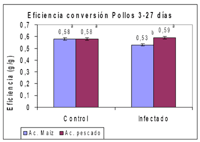 Figura 10.- Efecto de la infección por E. tenella sobre la eficiencia de pollos alimentados con aceite de maíz o aceite de pescado. (Korver y Klasing, 1997a).