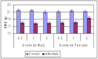 Hulan et al (1988) reportaron que incrementar el aceite de pescado de 2,1 a 4,1 % tuvo un efecto negativo sobre el consumo y el crecimiento.
