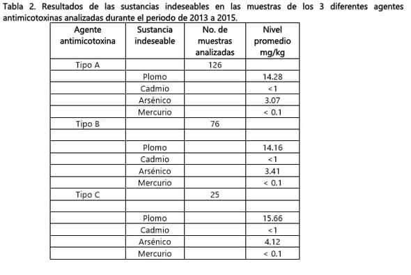 Hoy en día la preocupación por el monitoreo de estas sustancias indeseables ha aumentado y por esta razón se tuvo el interés de presentar un panorama de un control de calidad de 3 diferentes tipos de agentes antimicotoxinas (Denominados para este trabajo como tipo A, tipo B y tipo C). En la tabla 2 se presenta la cantidad de muestras monitoreadas para cada tipo de agente antimicotoxinas, la sustancia indeseable determinada y el nivel promedio de cada sustancia indeseable.