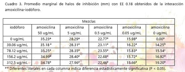 En el cuadro 3 se presenta la interacción del iodóforo y la amoxicilina, se observa que la interacción antibacteriano-desinfectante es indiferente.