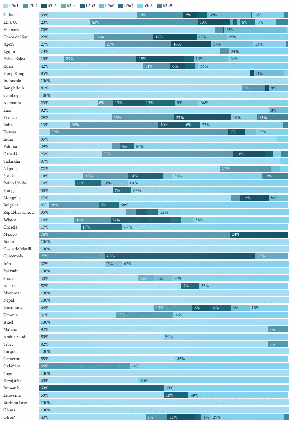 Figura 2. Distribución de los subtipos de influenza aviar h5nx por países.
