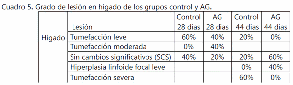 La proliferación de tejido linfoide y la reducción de las lesiones en el hígado en aves del grupo AG fueron mayores que el grupo control. Cuadro 5.
