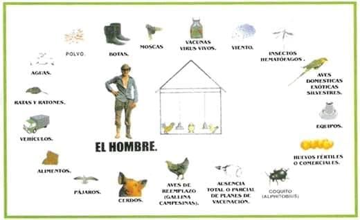 Ninguna empresa avícola, llámese integración o avicultor independiente, puede seguir trabajando sin una aplicación y evaluación diaria de todos y cada uno de los controles que conforman la cadena de BIOSEGURIDAD, al igual que no debe continuar sin cumplir las normas y requisitos necesarios para un buen funcionamiento de la empresa o granja avícola. Dentro de la bioseguridad, en el momento de la construcción de las granjas y durante los procesos laborales dentro de ellas es importante tener en cuenta todos los mecanismos de transmisión de enfermedades, pues a las granjas pueden llegar de muchas formas que veremos en la siguiente grafica: