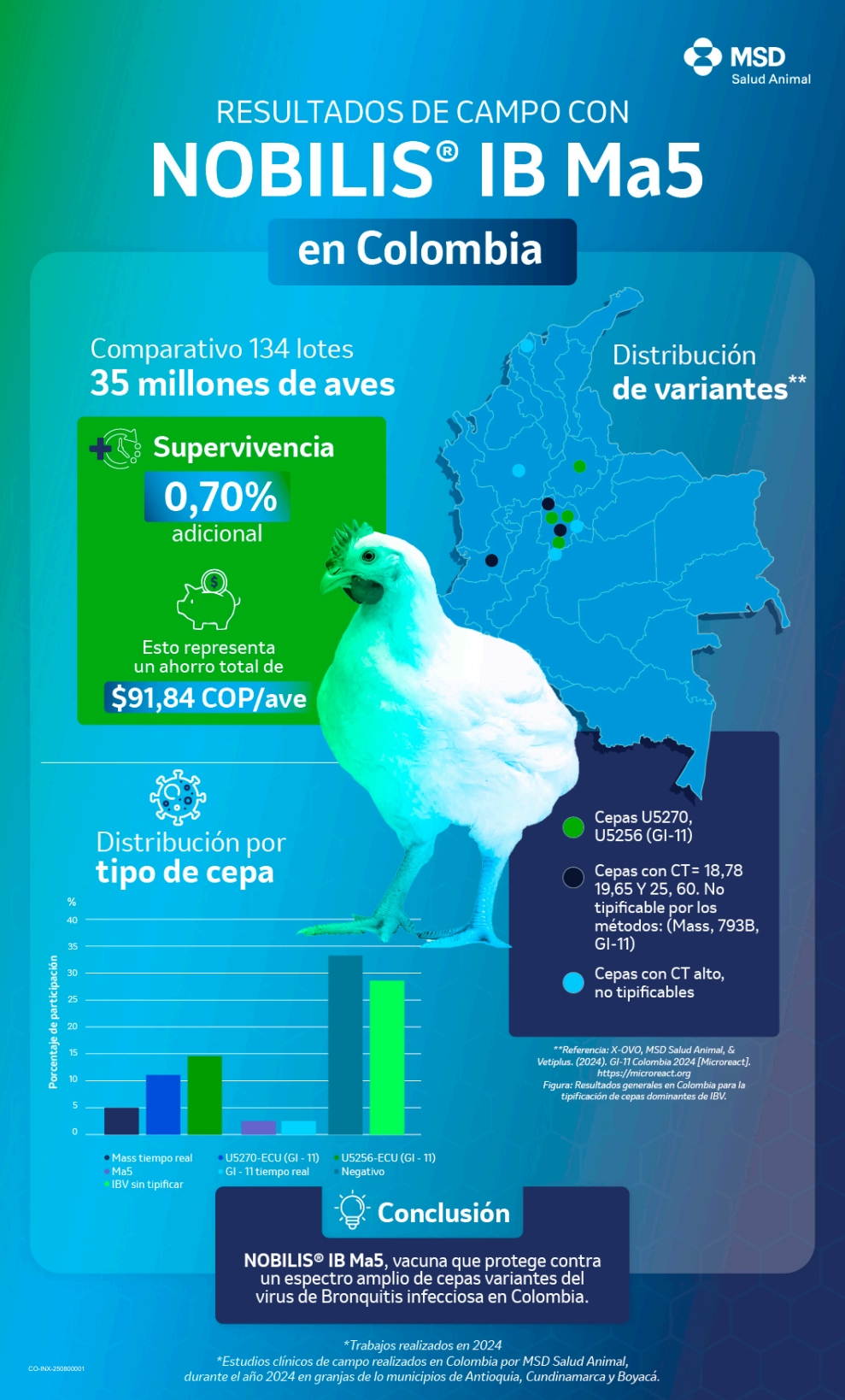 La siguiente Infografía nos demuestra la efectividad de la vacuna NOBILIS® IB Ma5 protegiendo contra un espectro amplio de cepas variantes del virus de Bronquitis infecciosa en Colombia.