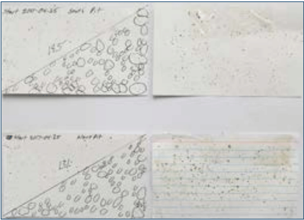 Figura 6. Ejemplos de las tarjetas con manchas colocadas en la fosa de gallinaza. Las tarjetas son marcadas con la fecha, lugar y número de manchas.