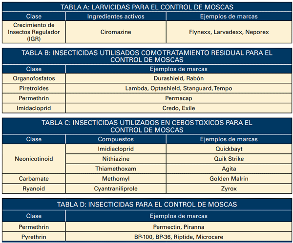 El cebo atrae a las moscas y se puede utilizar en trampas o colocarse como tratamiento en lugares dentro y fuera de las instalaciones. La tabla C, muestra algunas clases de cebos como neonicotinoid, ryanoid, y carbamate.