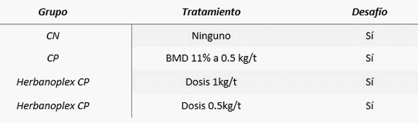 En la producción avícola intensiva se utilizan varios antimicrobianos, de manera sub-terapéutica, para mejorar los parámetros productivos de los pollos de engorde (Singer and Porter, 2019), sin embargo, este tipo de práctica ha generado la aparición de patógenos multirresistentes, entre ellos el Clostridium perfringens (CP). (You and Silbergeld, 2014; Nhung et al., 2017). Adicionalmente, las aves en la producción avícola moderna están expuestas a varios factores de estrés que generan inflamación intestinal y alteran el balance de la microbiota (Bhor et al., 2004; Zhang et al., 2013; Roberts et al., 2015). Es por esto que se han investigado y desarrollado varias alternativas naturales a estos promotores de crecimiento antibioticos como probioticos, prebioticos, fitobióticos, enzimas, entre otros. Muchos de estos compuestos han demostrado tener varias propiedades benéficas como antioxidantes, antiinflamatorios, antibacterianos e inmunoestimulantes (Sugiharto, 2016). Es por esto que el objetivo de este trabajo fue evaluar la eficacia de un fitobiótico (Herbanoplex CP) como mejorador de la performance productiva en pollos de engorde frente a un modelo de enteritis necrótica.