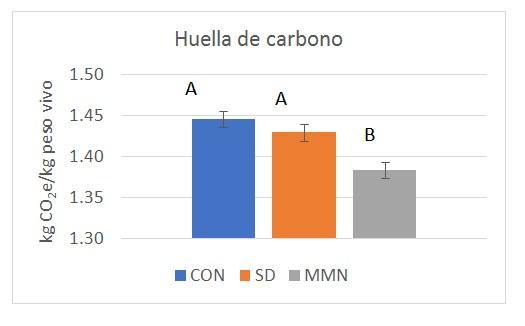 Figura 3. Huella de carbono comparando distintos tratamientos: Control (CON), Superdosis (SD) y Maxima matriz Nutricional (MMN).