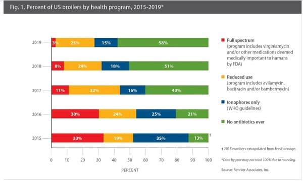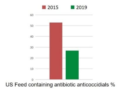 Además, el uso de antibióticos anticoccidianos en los Estados Unidos en 2019 también se ha reducido a la mitad en comparación con 2015.