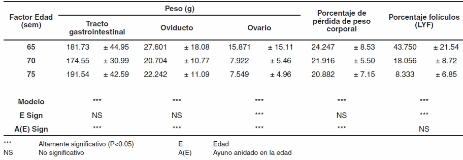 Con respecto a la edad a la cual se aplica el descanso ovárico (DO) sólo presentó efecto significativo (p< 0.05) en el peso del ovario y el porcentaje de folículos (LYF) (Tabla 2). El período de ayuno anidado en la edad, arrojó efecto significativo (p< 0.05) sobre las variables tracto gastrointestinal, peso del oviducto, peso del ovario y porcentaje de pérdida de peso.