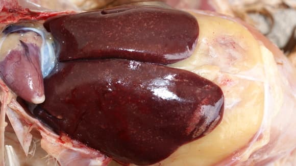 Ponedora comercial 76 semanas, mortalidad aguda con lesiones de hepatitis neurótica puntiforme, observar el pericardio con hemorragias petequiales igual que la grasa abdominal.