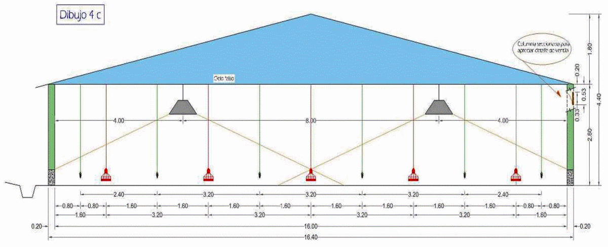 Figura 4- Galpón de 16m de ancho con 4 líneas de comedero y 8 líneas de bebedero