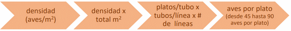 Partiendo esas líneas de equipo, pueden lograrse longitudes de galpones de hasta 204 metros. densidad aves/m2 densidad x total m2 niples/tubo x tubos/línea x # de líneas aves por niple (10 a 15 aves/niple, 12 para clima caliente