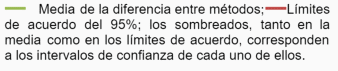 Adicionalmente, en la misma figura se puede observar que 68 de las 72 comparaciones (el 94.4%) se encontraron dentro de los límites de concordancia, lo cual está muy cerca del 95% que es lo que se espera para una buena concordancia según los autores de esta metodología [6].