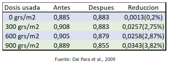 A continuación, un cuadro que muestra la Aw antes y después de usar cal viva.