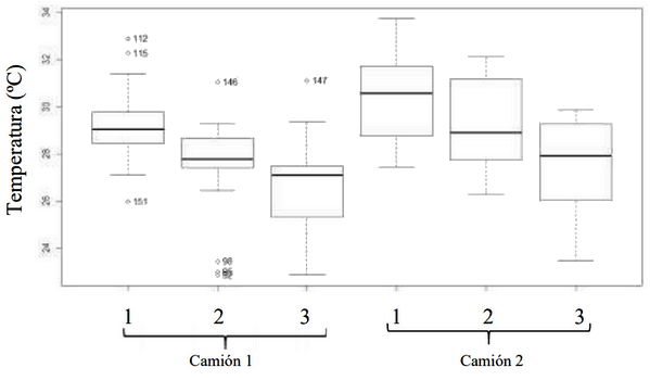 Por último, la sonda de CO2, se ubicó en el centro de las cargas en la altura 3 (Figura 1). Las condiciones que presentaron los camiones fueron distintas; el camión 1 estaba equipado con 3 equipos de refrigeración, una capacidad de carga mayor y una temperatura de referencia para los termostatos de 27ºC, mientras que el camión 2 estaba provisto con 2 equipos de refrigeración, una capacidad de carga menor que el camión 1 y una temperatura de referencia para los termostatos de 25ºC.
