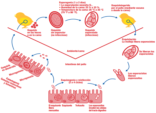 Cada ciclo requiere que el ave ingiera ooquistes esporulados. El parásito invade las células intestinales y se multiplica dentro de ellas varias veces, y el ciclo termina con la expulsión de los ooquistes no esporulados en las heces. Luego, si las condiciones de la cama son adecuadas (oxígeno, temperatura y humedad), los ooquistes esporulan en la cama, y están listos para repetir el ciclo.