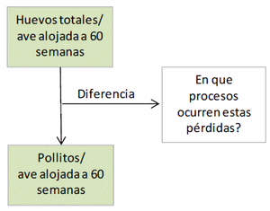 El potencial genético reproductiva de la estirpe Ross, indica que una hembra reproductora puede producir hasta 168 huevos totales y 139 pollitos a las 60 semanas de edad (Manual reproductoras Ross, 2016) lo que refleja una eficiencia de 83%. La diferencia numérica entre ambos indicadores, es de 29 y que para la finalidad de este estudio, será considerado como un estándar. En la Figura 1 se describe la definición del problema.