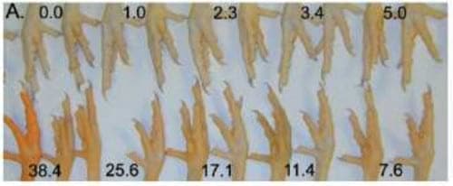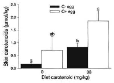 Figura 3. Efecto de los carotenoides de la dieta en la pigmentación de la piel. Los pollitos fueron obtenidos de gallinas alimentadas con dietas sin carotenoides o con carotenoides. (A) Cada par de patas de pollitos de gallinas alimentadas con carotenoides se muestra con la concentración (mg/kg dieta) total de carotenoides (luteína+cantaxantina 4:1) de la dieta del pollo. (B) Concentración total de carotenoides en la piel de las patas (mean ± ESM) de pollos provenientes de gallinas con carotenoides (C+) o sin carotenoides (C-) en la dieta y alimentados hasta las cuatro semanas de edad con 0 o 38 mg de carotenoides totales/kg de alimento. a–c Barras con superescrito diferente indican diferencias significativas (P < 0.05). Fuente: Koutsos et al. (2003).